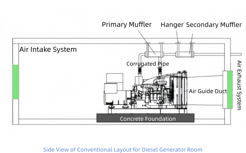 The conventional layout of a diesel generator room is shown in Figure 3 and Figure 4.